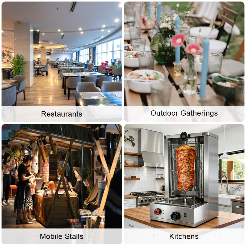 - آلة الشاورما التي تعمل بغاز البترول المسال والتدفئة بالأشعة تحت الحمراء، توفر شواية الكباب الشرق أوسطية التي تعمل بالغاز، تسخينًا سريعًا ودرجات حرارة عالية مستقرة وكفاءة منخفضة في الطهي مع دخان منخفض، مما يضمن طهي اللحم الطري والعصير بشكل متساوٍ مع تحمير مثالي.