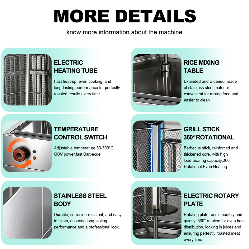5.【Practical & Portable】Weighing about 51lbs (23kg), our vertical rotisserie is incredibly lightweight and portable. Take it with you to any location for convenient grilling, whether it’s in your indoor kitchen, for outdoor gatherings, or mobile food stalls. Just enjoy mouthwatering meals without the long wait!
