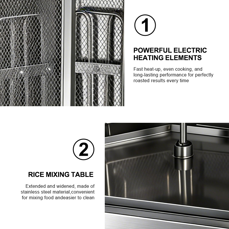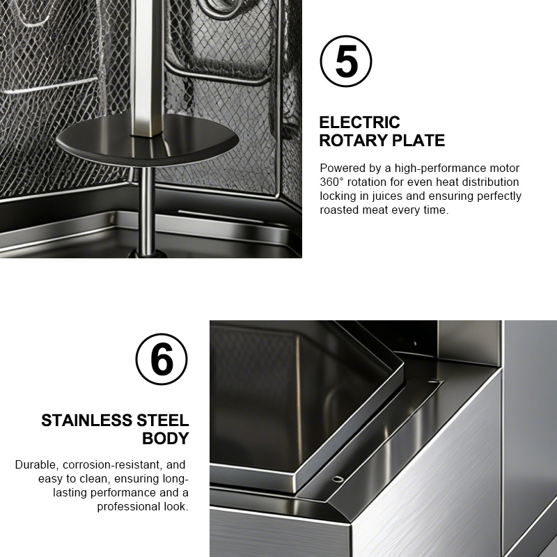 2.【360° Rotational Heating】Our shawarma grill machine features a robust copper wire motor that employs rotational heating, ensuring that your food is cooked to perfection with an irresistible flavor. And an oil catching device on the bottom to prevent spills.