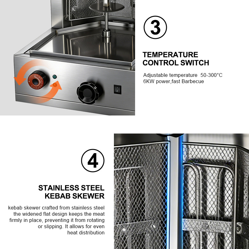 3.【Temperature Control】Elevate your grilling experience with our cutting-edge gyro rotisserie featuring a dual heating tube. The independent temperature control technology empowers you to tailor the temperature to your foods