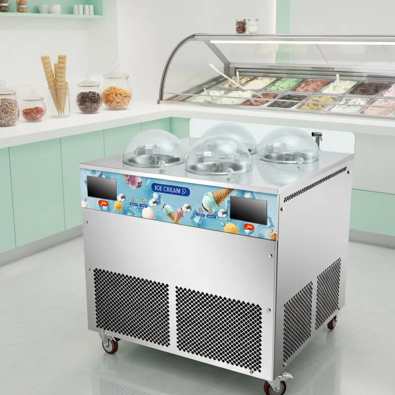 The equipment features an independent three-head cooling and mixing system (6L x 4 mixing tanks, 1HP x 4 compressors), allowing each cylinder to operate simultaneously or independently without interference. It supports the simultaneous production and display of multiple flavors, meeting the needs of stores with diverse product lines, and is particularly suitable for Italian ice cream shops, chain dessert shops, and commercial display-type sales environments.