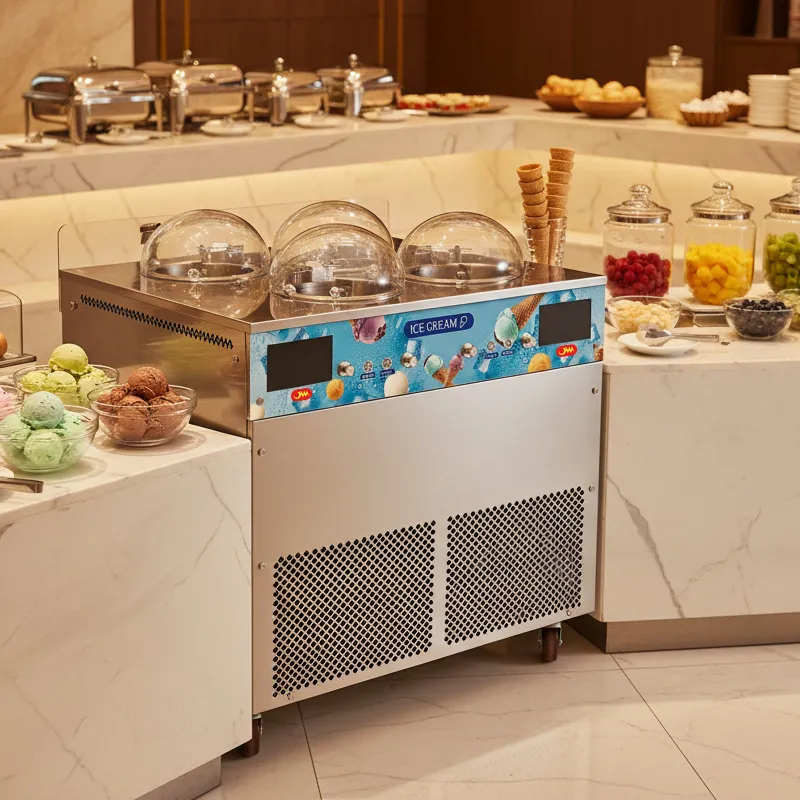 In summary, the JMYLB-20 Italian hard ice cream machine is a high-performance device designed for the commercial market, integrating intelligent production, independent multi-head operation, stable freezing and preservation, and front-of-house display and sales. With a high production capacity of 40L/H, a reliable structure, and an easy-to-maintain design, it helps restaurants and distributors improve operational efficiency and sales conversion while ensuring consistent product quality. It is an ideal choice for Italian ice cream shops, chain restaurants, and commercial projects.