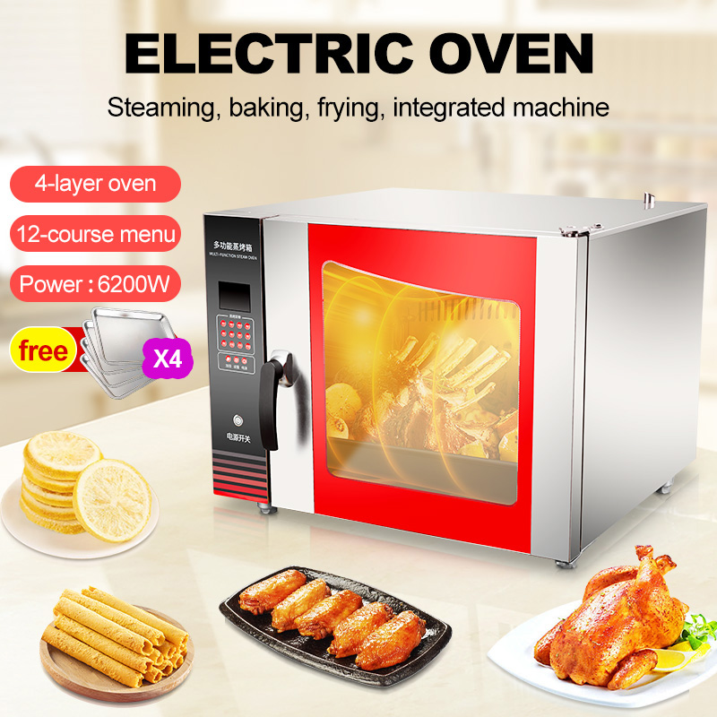 This appliance uses enclosed heating elements to bake, roast, and steam food evenly with hot air circulation, suitable for making cakes, breads, roasted meats, pizzas, pastries, and other whole or portioned ingredients.