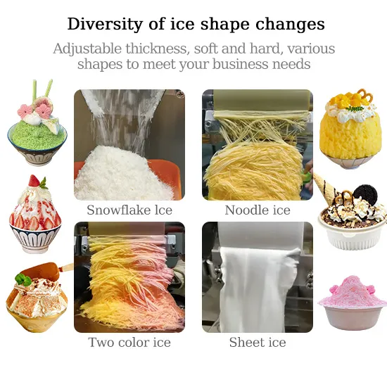 By adjusting raw materials and evaporator speed, users can easily create different ice textures—snow ice, noodle-style ice, flake ice, needle ice, and more. Texture can range from light and smooth to rich and delicate, helping shops offer diverse dessert styles from one machine.
